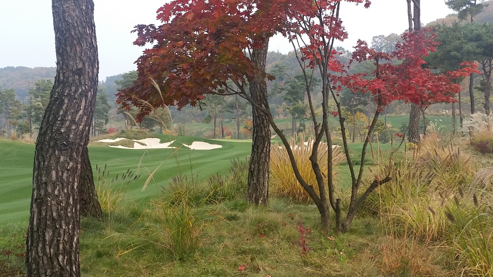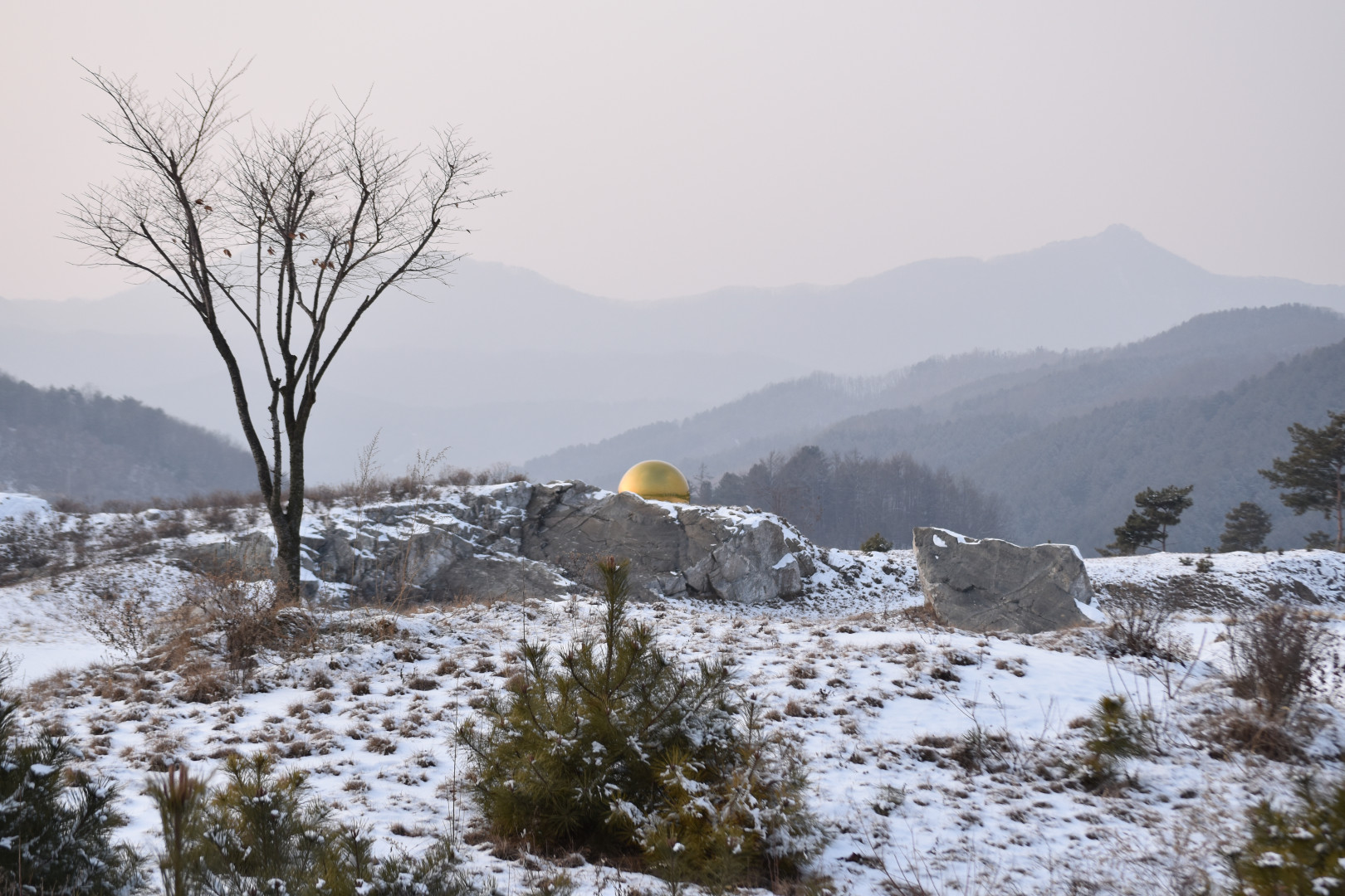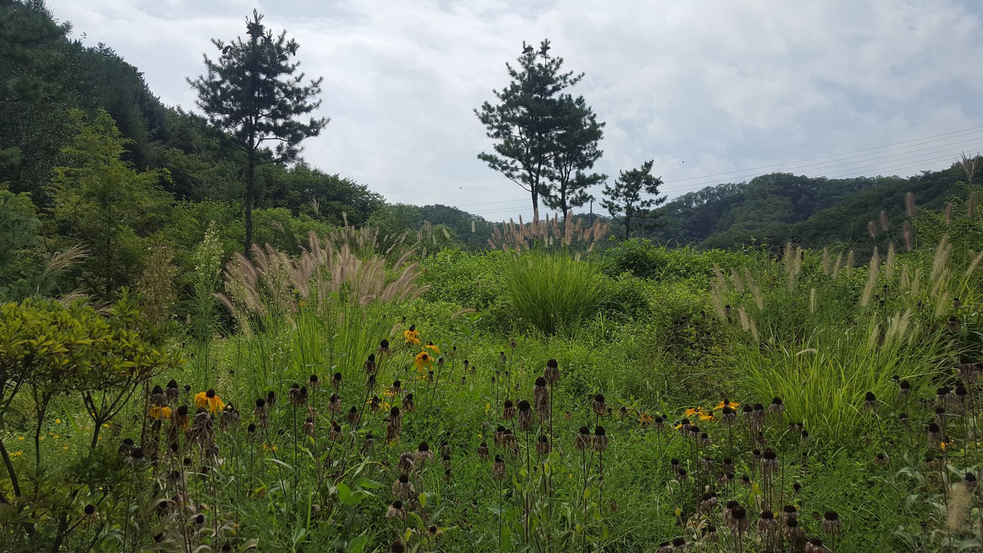 Zelkova, Japanese Red Pine saplings, native limestone, Yellow Ball, and Geombong (Geom peak)
