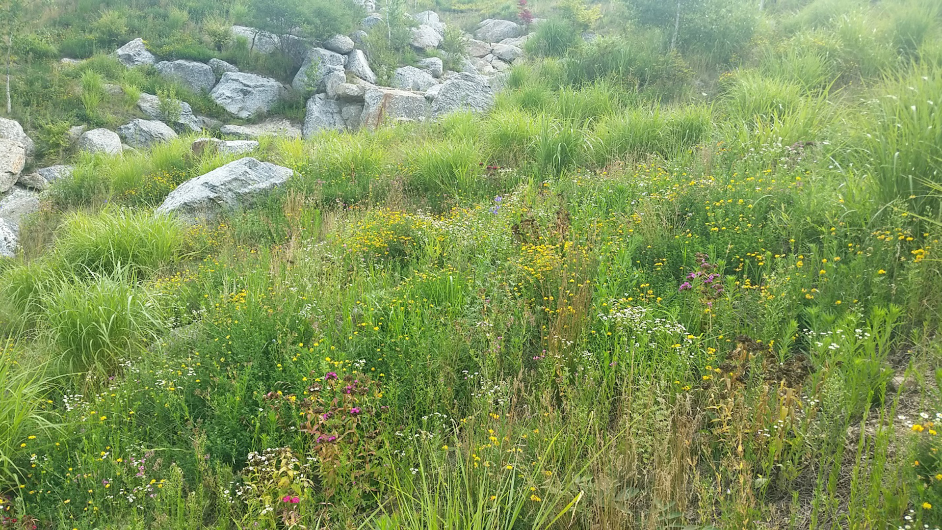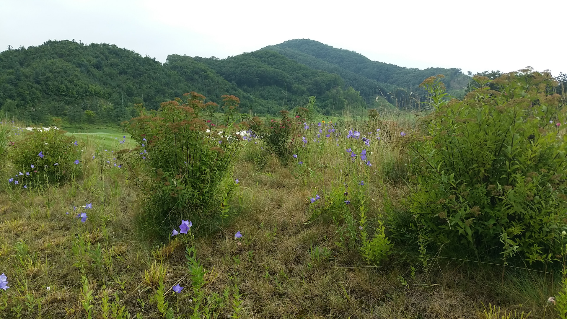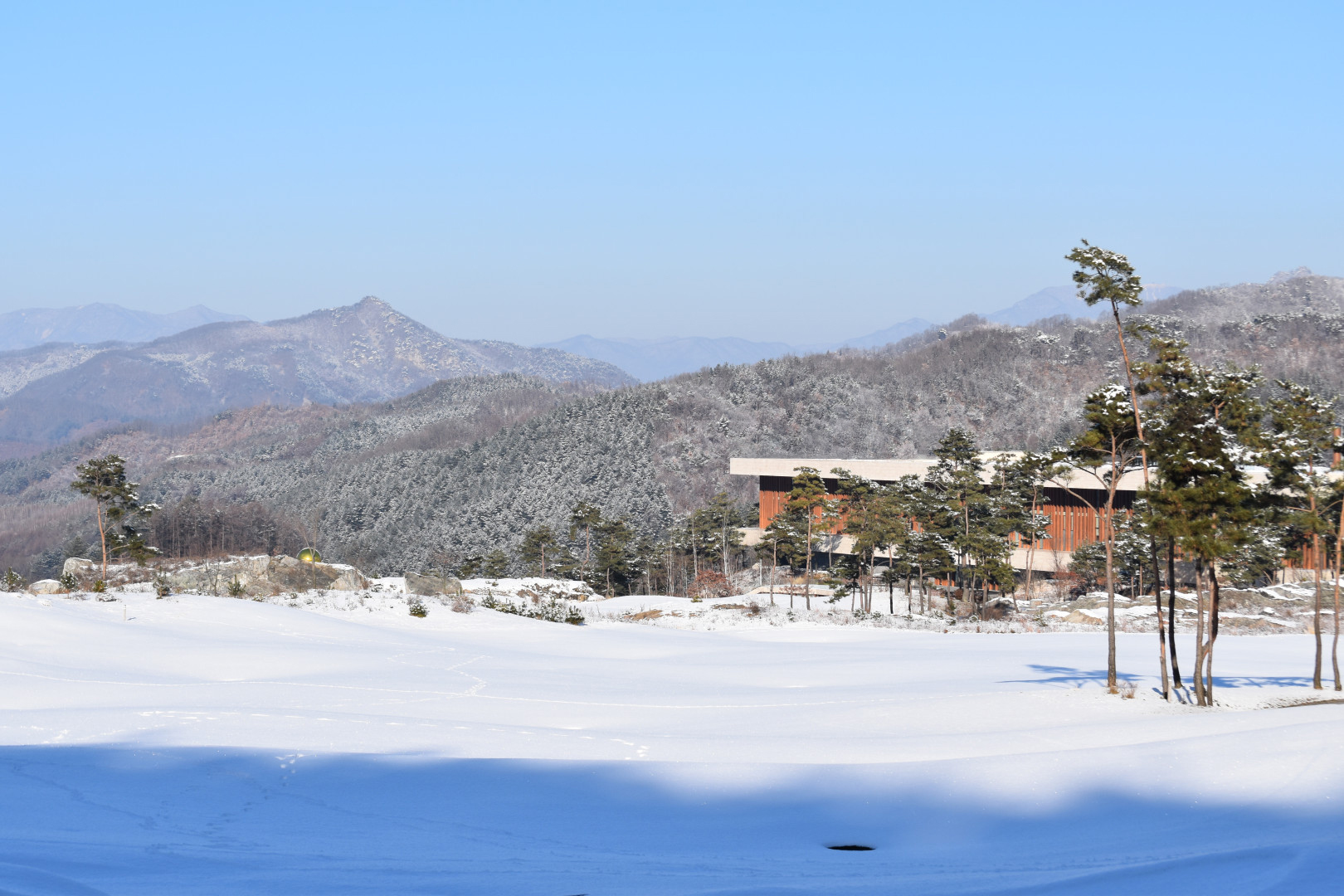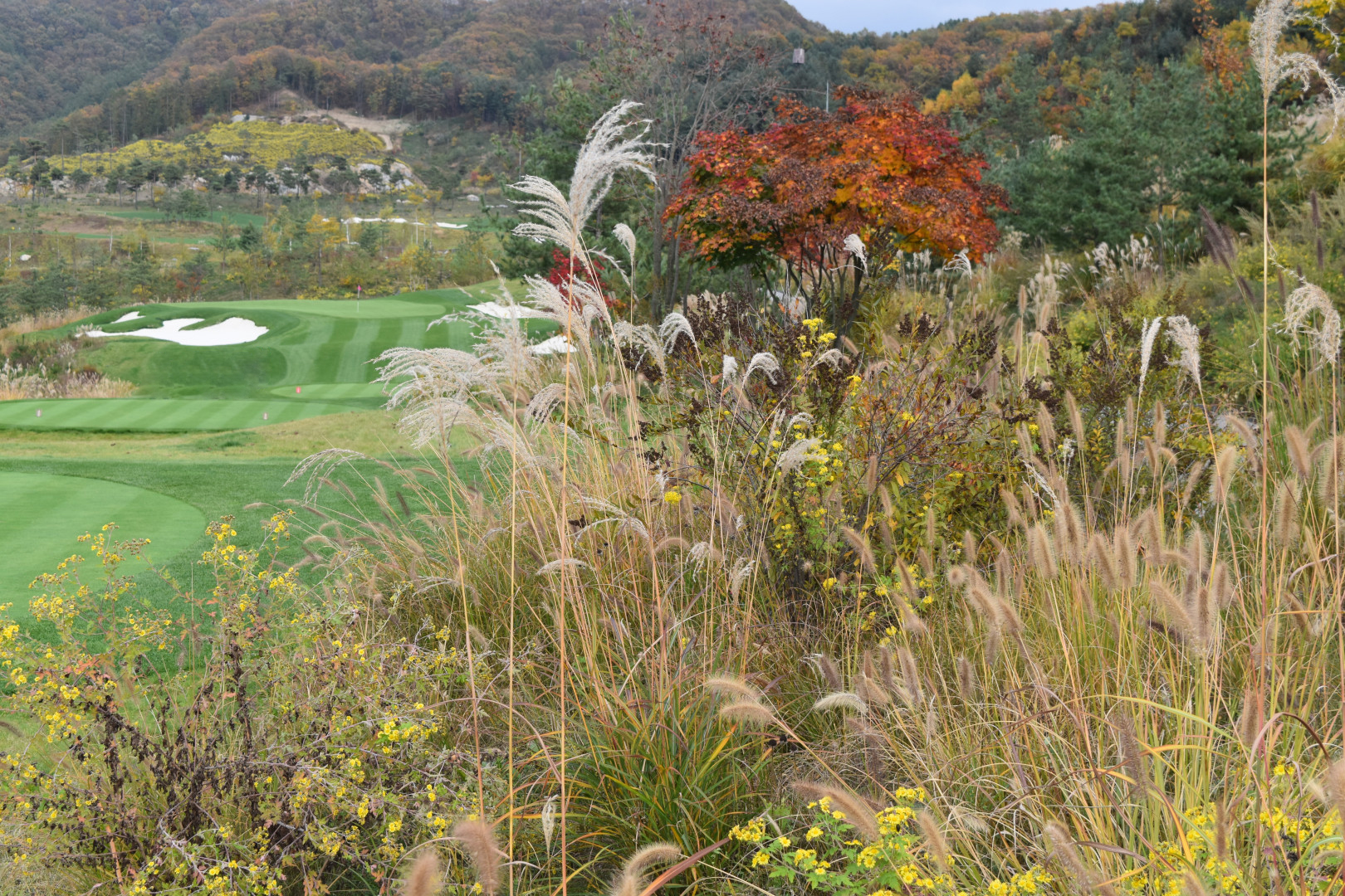 Zelkova, Japanese Red Pine saplings, native limestone, Yellow Ball, and Geombong (Geom peak)